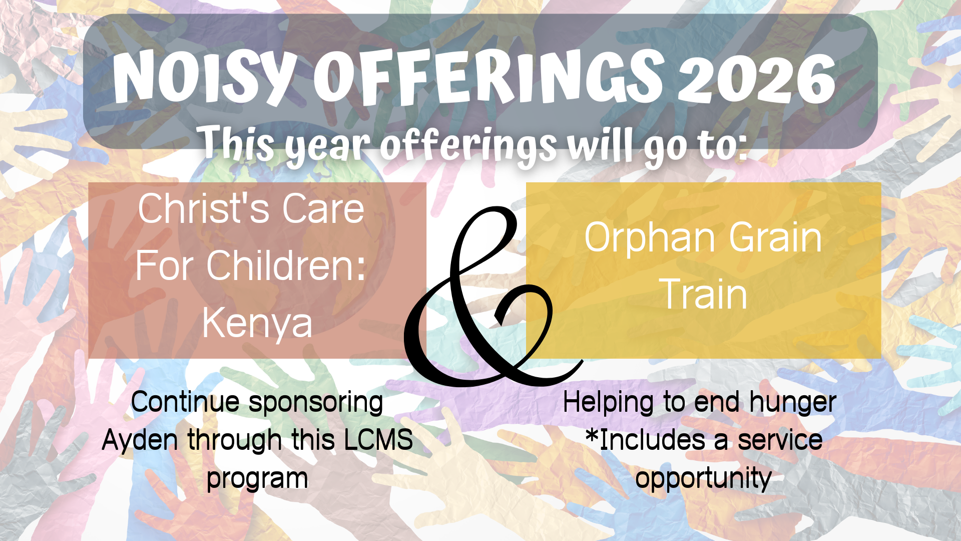 We’re collecting coins for TWO ministries this year: Christ’s Care for Children: Kenya where we will sponsor a child, and Orphan Grain Train, which works to end hunger around the world.